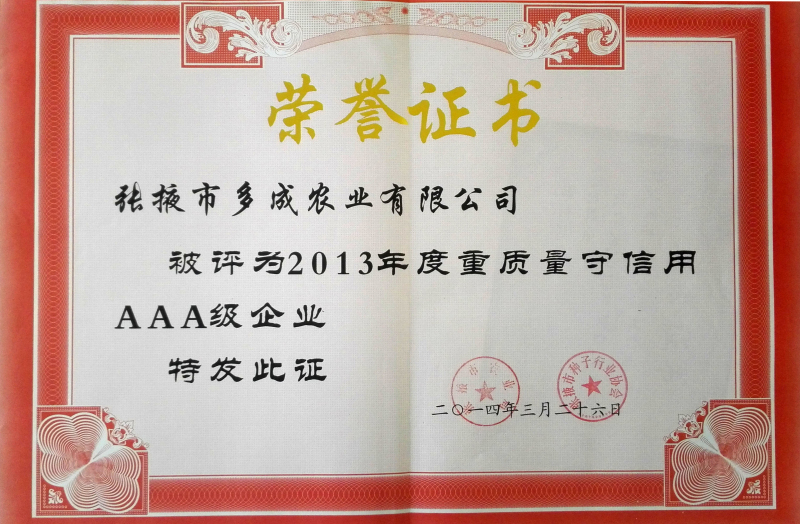 2013年度重質(zhì)量守信用AAA級(jí)企業(yè)